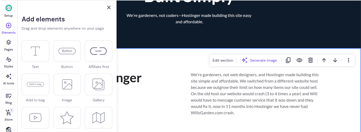 We’re gardeners, not web designers, and Hostinger made building this site simple and affordable. We switched from a different website host because we outgrow their limit on how many items our site could sell. On the old host our website would crash (3 to 4 times a year) and Will would have to message customer service that it was down and they would fix it, now in 11 months into Hostinger we have never had WillsGarden.com crash.